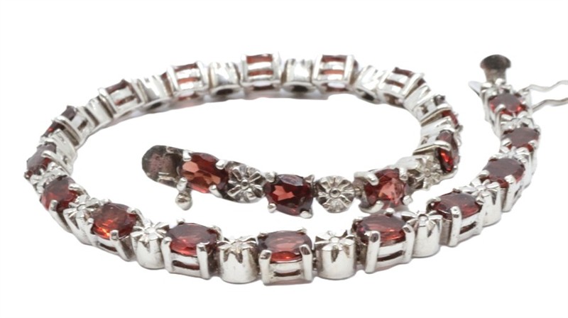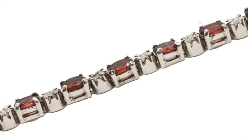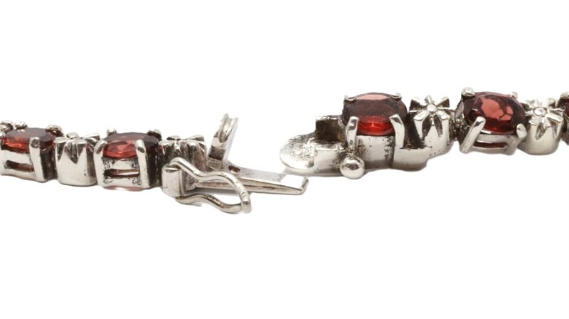 Stříbrný náramek s granáty. Stříbro 925/1000. Přírodní granáty (almandiny), celková váha 5,88 ct. Váha náramku: 13,82 g. Délka náramku: 19,5 cm.