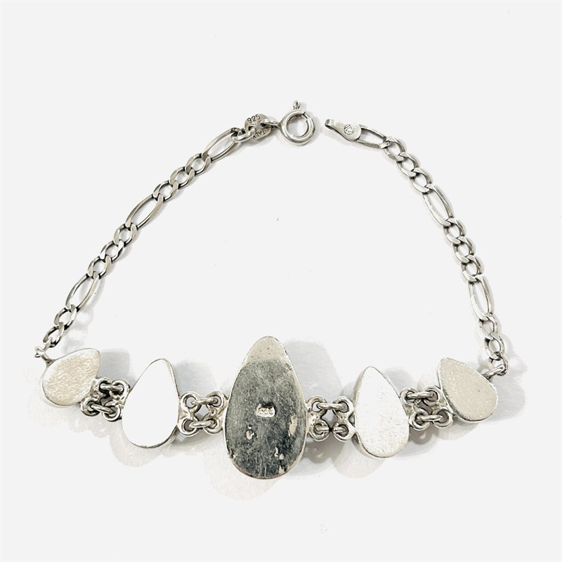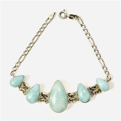 Naturalisticky pojatý náramek s důrazem na články osazené stupňovitě velkými přírodními larimary brusu kapková mugle, fasováno v plně přiléhajících obrubách, připojena nepůvodní řetízkovina vazby "figaro". Solidní stříbrnická práce z konce 20. století, články patrně středoamerické provenience, řetízek italského původu. Zhotoveno z nezlaceného stříbra o ryzosti 925/1000; nově opatřeno puncem S-61 (kozlík 2), ryzostní číslo, značka výrobce a značení "ITALY" na koncích, ryzostní číslo zespod článku. Hmotnost 14,09 g, délka 19,5 cm, šířka 22 mm. Zapínání formou pérového kroužku v pořádku, zachovalém stavu.