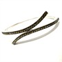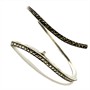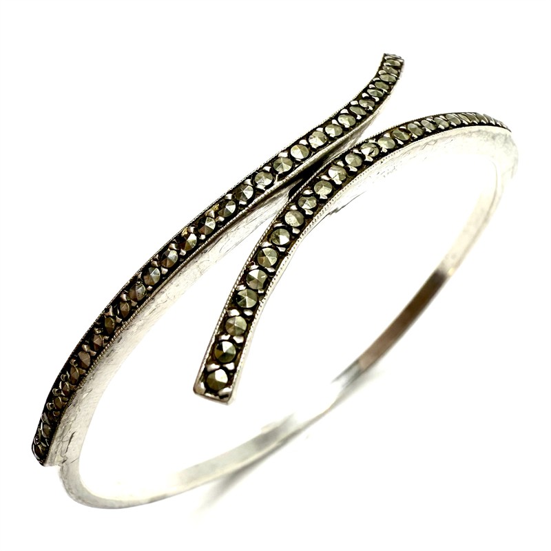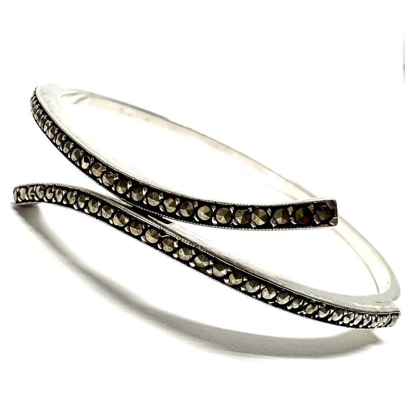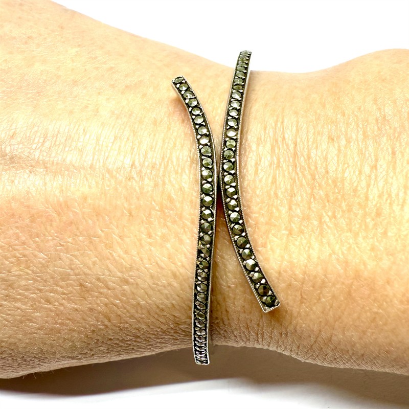 Jemný, elegantní stříbrný, kruhový náramek. Šperk zdobí dvě efektně zahnuté řady drobných, decentně se třpytících markazitů. Náramek byl zhotoven ze sterlingového stříbra (925/1000), o celkové váze 16,26 g. Rafinovaně skryté zapínání. Díky průměru 5,7 cm je šperk vhodný spíše na subtilní zápěstí. Výborný stav.