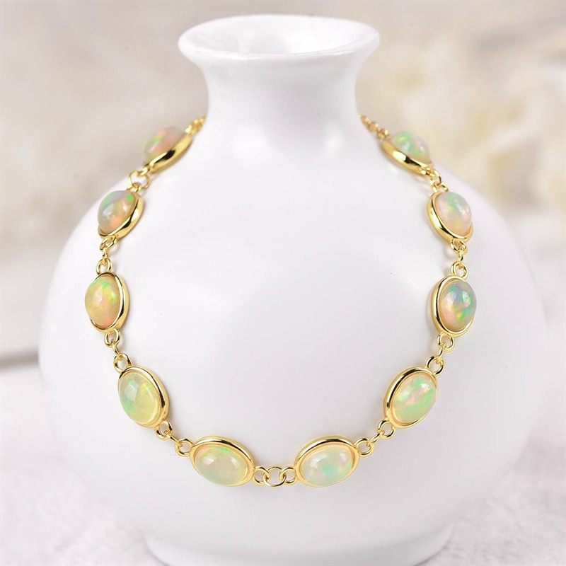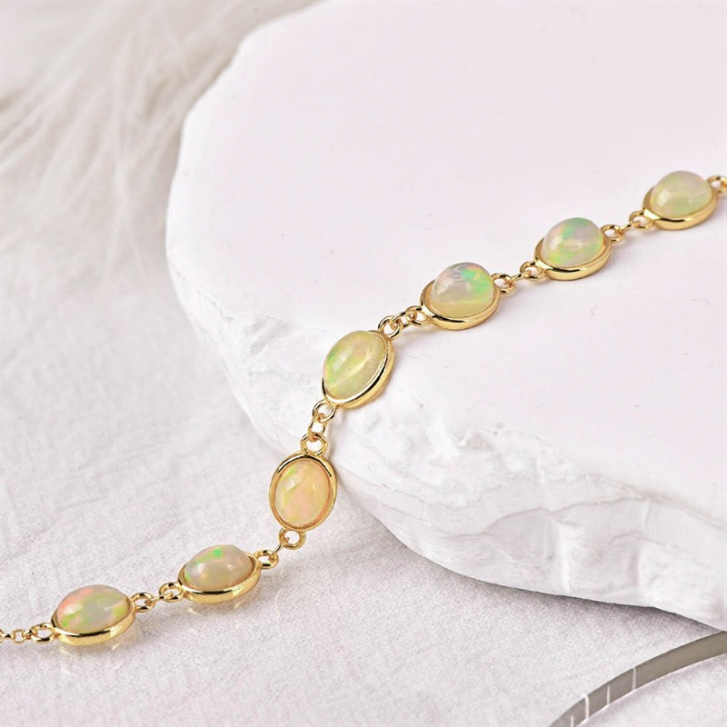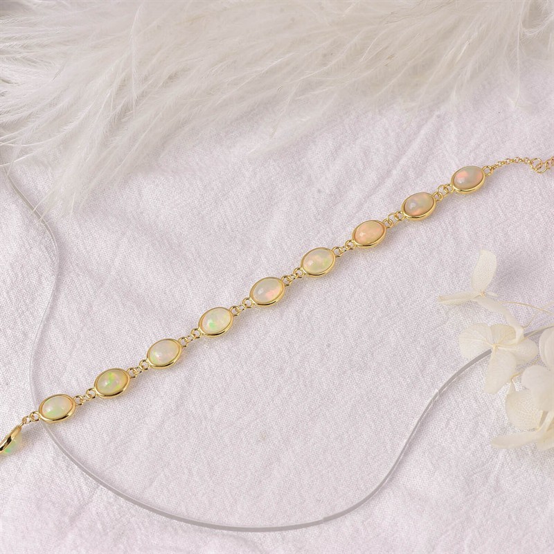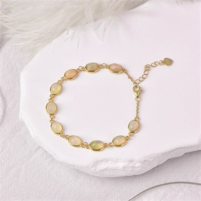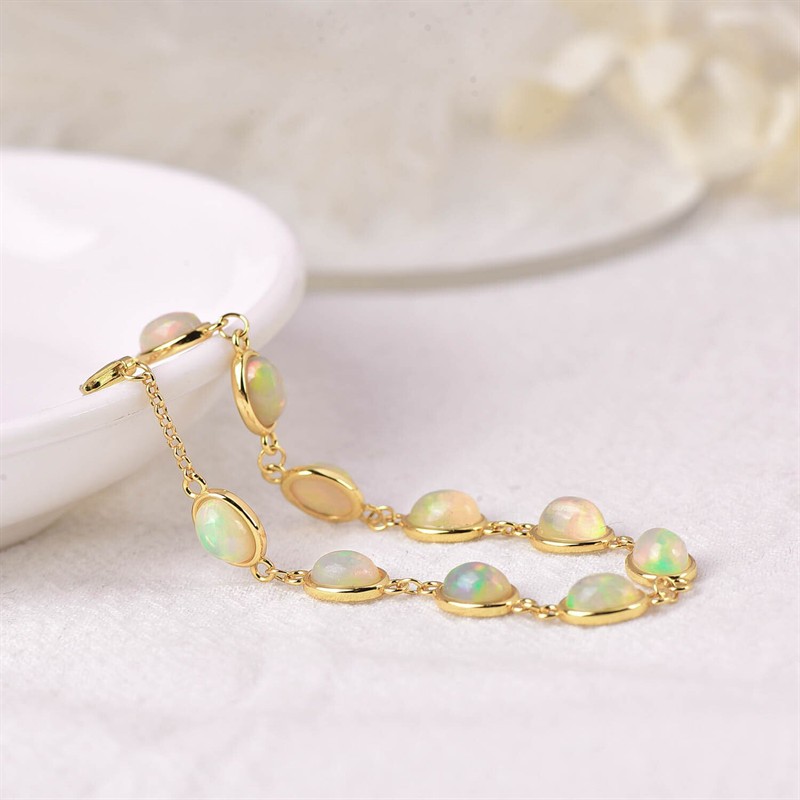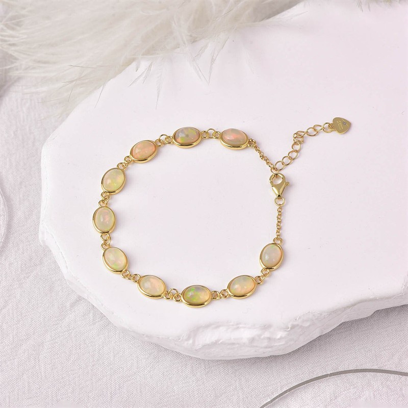 stříbrný zlacený náramek s přírodními opály, 10 kusů o velikosti 5 x 7 mm, celkem 14,80 ct, certifikát. Celková hmotnost Ag 3,89 g/925/1000, punc. Západní Evropa, začátek 21. století, nastavitelná délka 15 až 19,5 cm