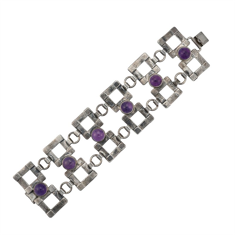 Materiál: stříbro o ryzosti 925/1000 Hmotnost: 68,55 g Rozměry: délka 20 cm, šířka 4,8 cm Drahokamy: - 6 ks přírodních ametystů Stav: výborný Původ: zlatnická práce, opatřená platným puncem Puncovního úřadu České republiky Pro vaše maximální pohodlí nabízíme kompletní zlatnický servis: úpravy velikosti, odborné opravy, rhodiování, výměny kamenů, profesionální čištění, leštění i znalecké odhady. Vše přizpůsobíme vašim přáním.
