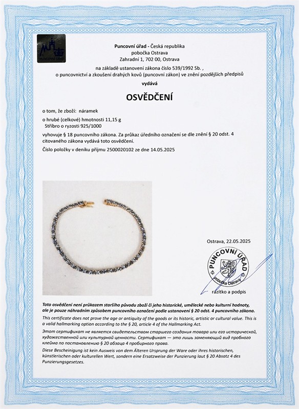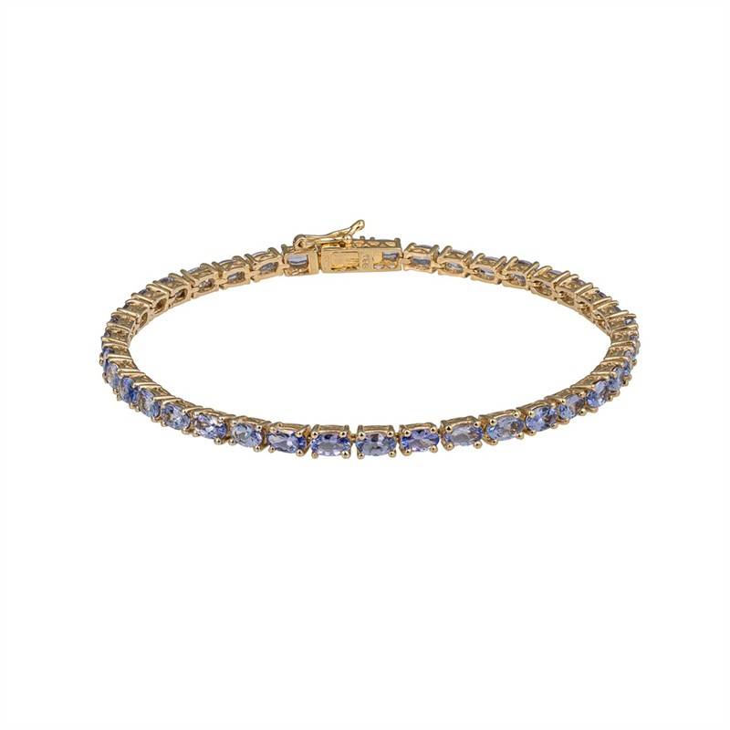 Stříbro o ryzosti 925/1000 pozlacené stříbro váha 11,15 g přírodní tanzanity 39 ks cca 8 ct délka 20,5 cm, šířka 0,4 cm výborný stav osvědčení puncovního úřadu kameny s garancí pravosti zkontrolované v gemologické laboratoři
