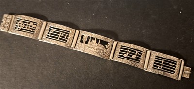 Stříbrný náramek se siluetou Pražského hradu, lvem - státním znakem Protektorátu Čechy a Morava a závěrečnými takty státní hymny s textem „Země česká domov můj“ , stříbro 900/1000, puncováno – punc trojúhelník se šachovnicí a číslem 4, první polovina 40. let m.s., mistrovská značka JČ, rozměr 17, 5 x 2 cm, hmotnost 27 g,