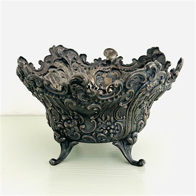 Dekorativní, honosný nástolec či miska na nožičkách pro odkládání nejen drobných předmětů. Plasticky pojatý novorokokový plášť s bohatými dekory (rokaj, rozviliny) s vysoce členitým okrajem. Kvalitní stříbrnická práce hanauské dílny Storck & Sinsheimer z poslední čtvrtiny 19. století, jež svou činností navazovala na historickou tradici výroby zdobného tepaného stříbra v tomto městě.