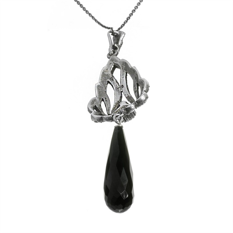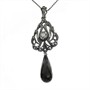 Stříbrný přívěs s řetízkem zdobený onyxem a markazity. Řetízek: 925/1000, přívěs 835/1000, celková váha: 9,95 gr. K dispozici osvědčení Puncovního úřadu. Délka řetízku: 51 cm, délka přívěsu: 8,6 cm, šířka přívěsu: 2 cm Čechy, kolem roku 1920