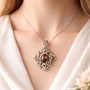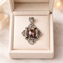 Almandin v hlubokých červených až vínových odstínech se elegantně vyjímá uprostřed šperku, obklopen jemně propracovaným stříbrným rámem, který evokuje umění starých mistrů šperkařů. Celek působí ušlechtile, výrazně a přitom s lehkou noblesou. Přívěsek je vyroben ze stříbra o ryzosti 800/1000 a nese platný punc. Váží 15,70 g a měří přibližně 5,5 × 3,5 cm. Almandin má rozměry cca 1 x 1,5cm. Šperk je ve velmi pěkném stavu. Snoubí se v něm krása minulosti s nadčasovou elegancí.