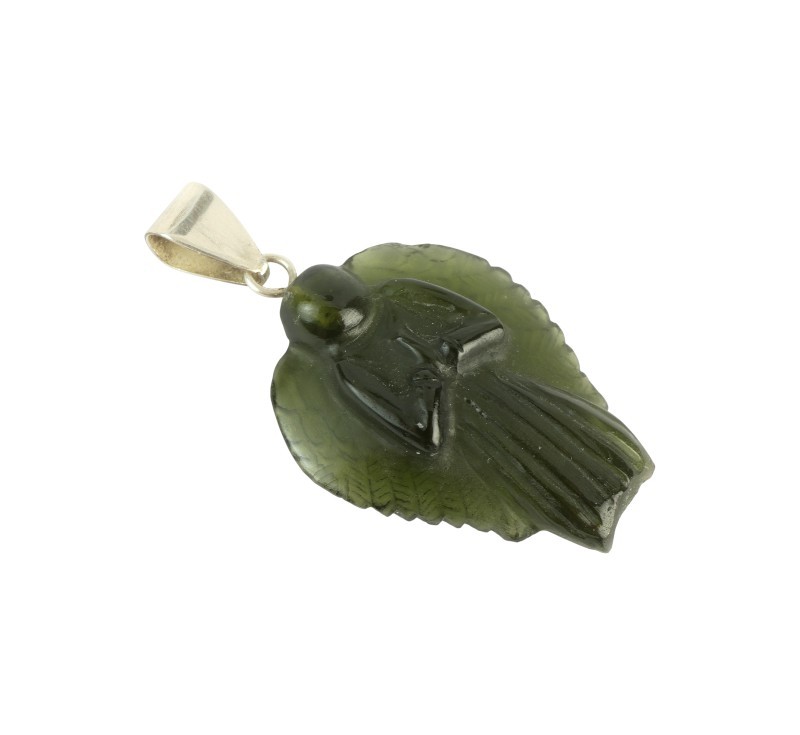 Nevšední, větší přívěšek, jehož tělo je tvořeno ruční glyptikou přírodního vltavínu do postavy anděla strážného, tradičním ochranitelským symbolem. Oboustranně detailně ryto, decentní masivnější očko pro zavěšení. Tuzemská kvalitní řezačská práce z první pětiny 21. století. Ouško zhotoveno z nezlaceného stříbra o ryzosti 925/1000; ryzostní číslo zezadu. Hmotnost 6,71 g, celková délka 46 mm, šířka 25 mm. Ve velmi zachovalém stavu.