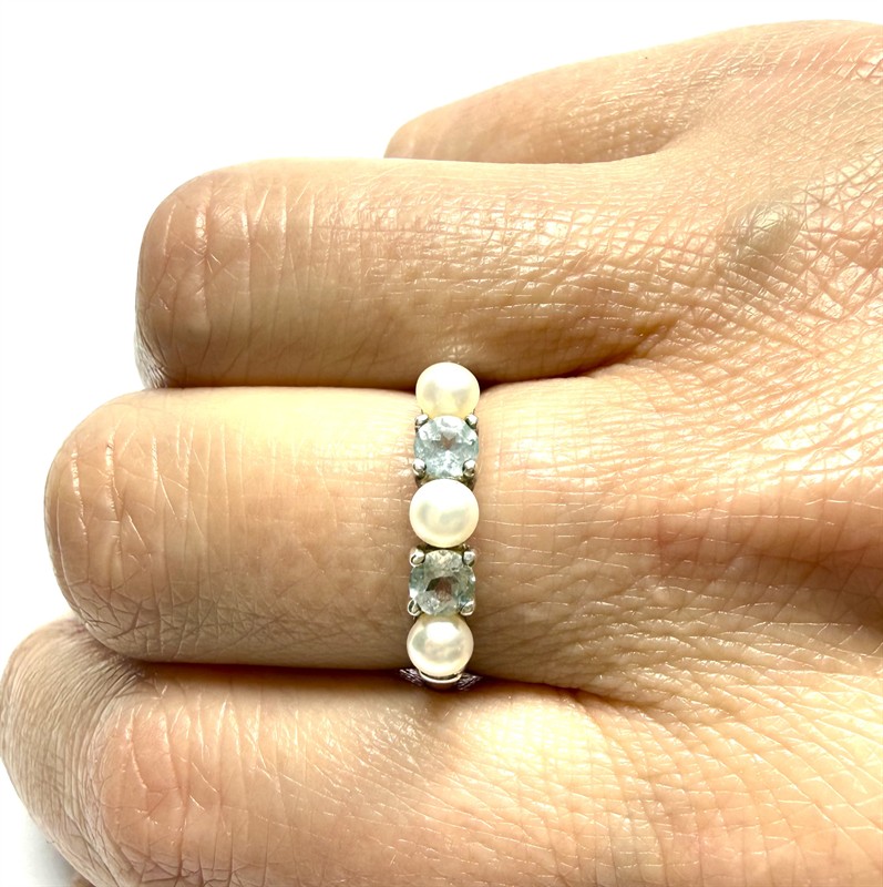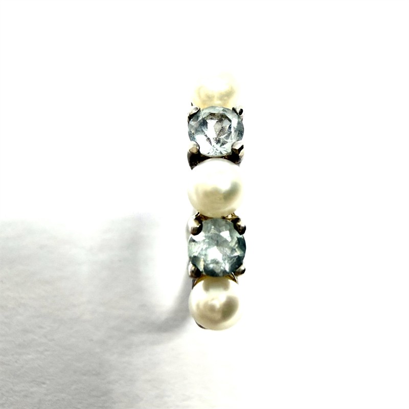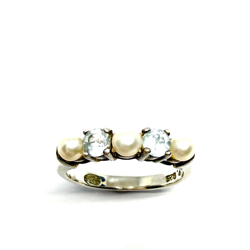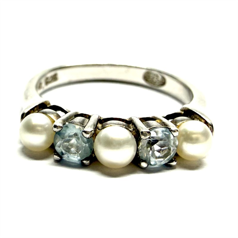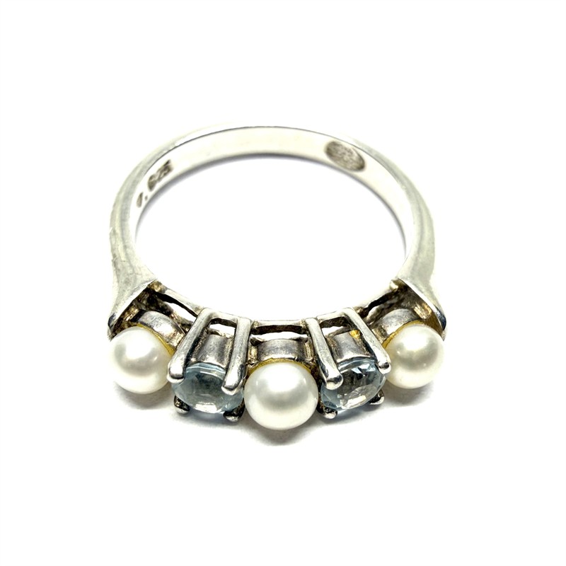 Stříbrný prsten s bílými perlami a modrými topazy