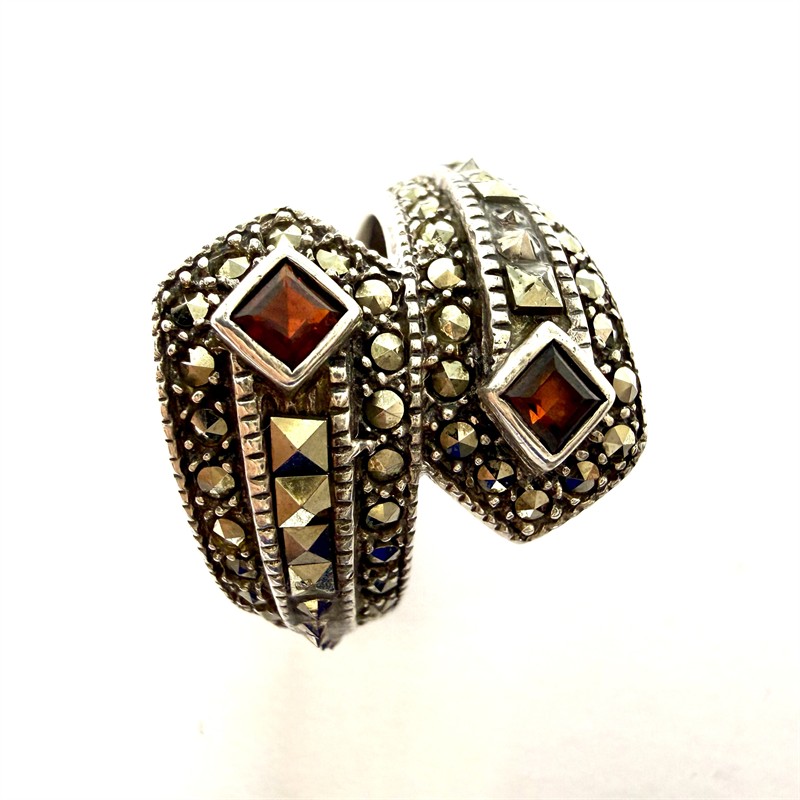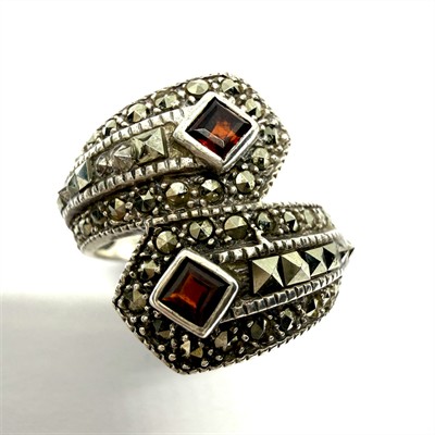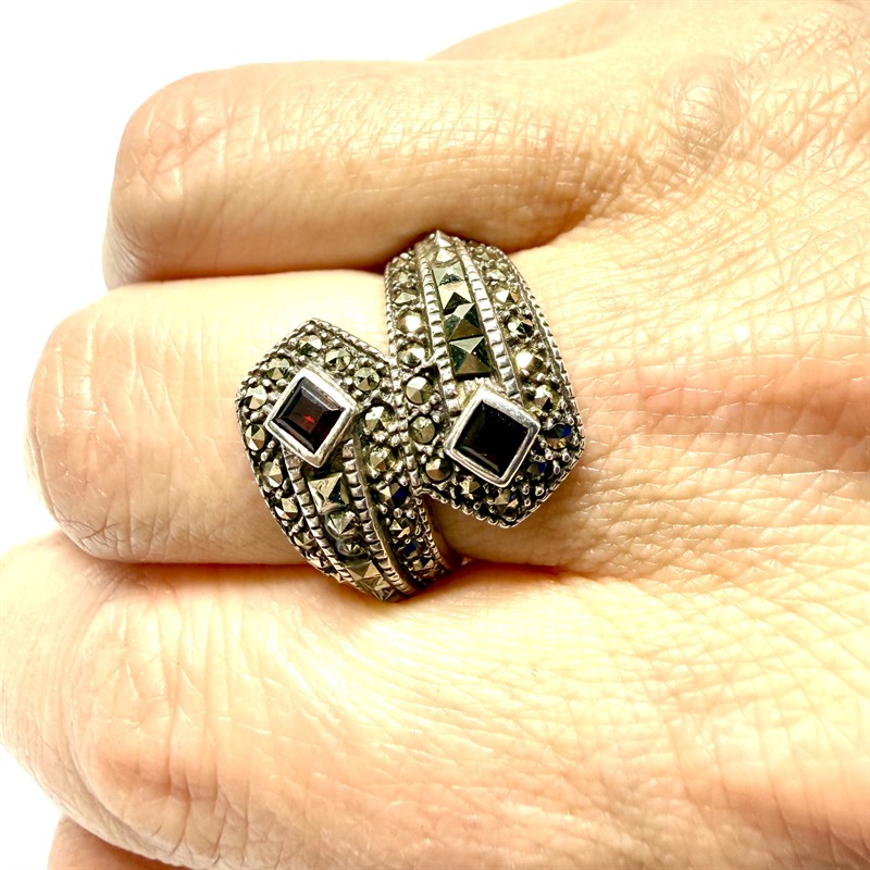 Půvabný, stříbrný prsten nevšedního tvaru. Šperk zdobí granáty čtvercového tvaru, kontrastně dozdobené elegantně se třpytícími markazity. Sterlingové stříbro (925/1000). Celková váha 6,70 g. Velikost 56. Velmi dobrý stav.