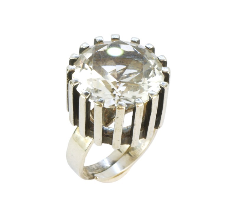 Prsten vyrobený ze stříbra ryzosti 925/1000 zdobený velkým horským křišťálem. Švédská, autor Bengt Hallberg - značeno na prstenu zkráceně BeH. Značka konvence platná i v České republice. Průměr hlavy prstenu 1,5 cm. Velikost lze upravit.