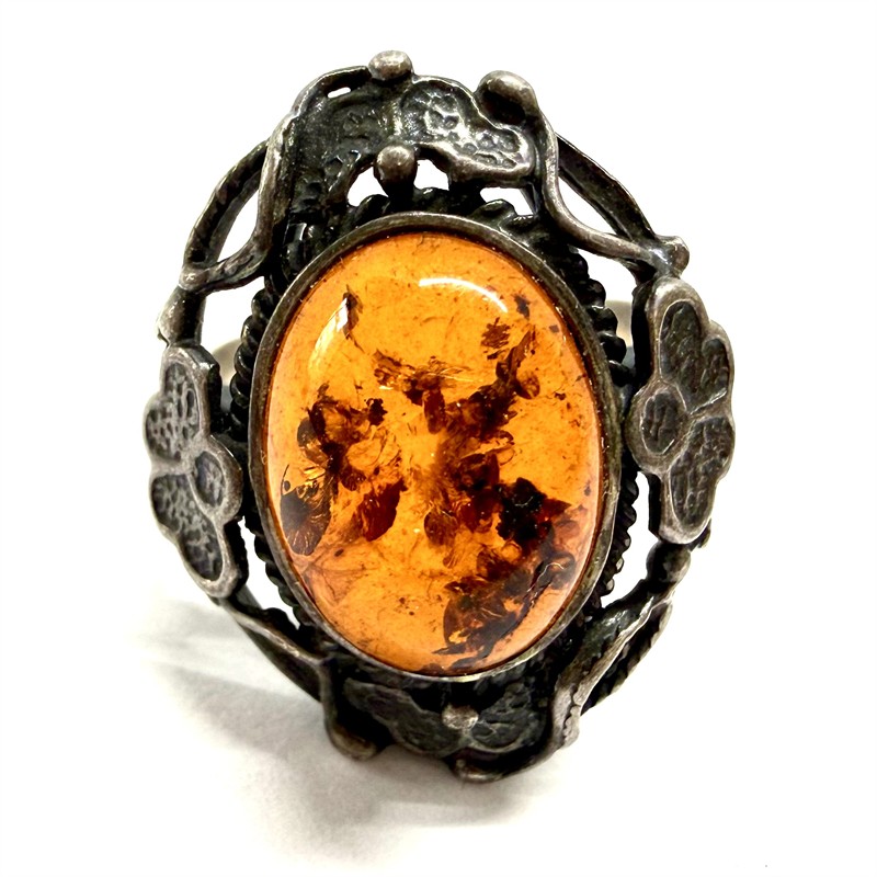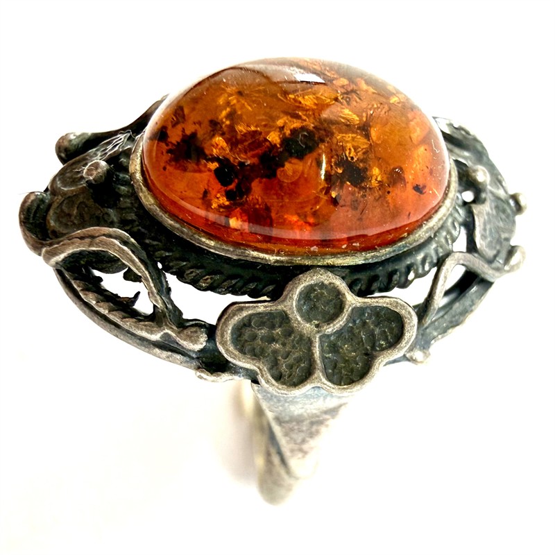 Půvabný, originální stříbrný prsten. Šperk byl zhotoven v secesním duchu ze sterlingového stříbra (925/1000), o celkové váze 5,63 g. Střed šperku je osazen jantarem s bohatou inkluzí. Velikost 60. Šperk byl ponechán s původní půvabnou patinou a je v perfektním stavu.