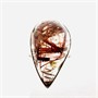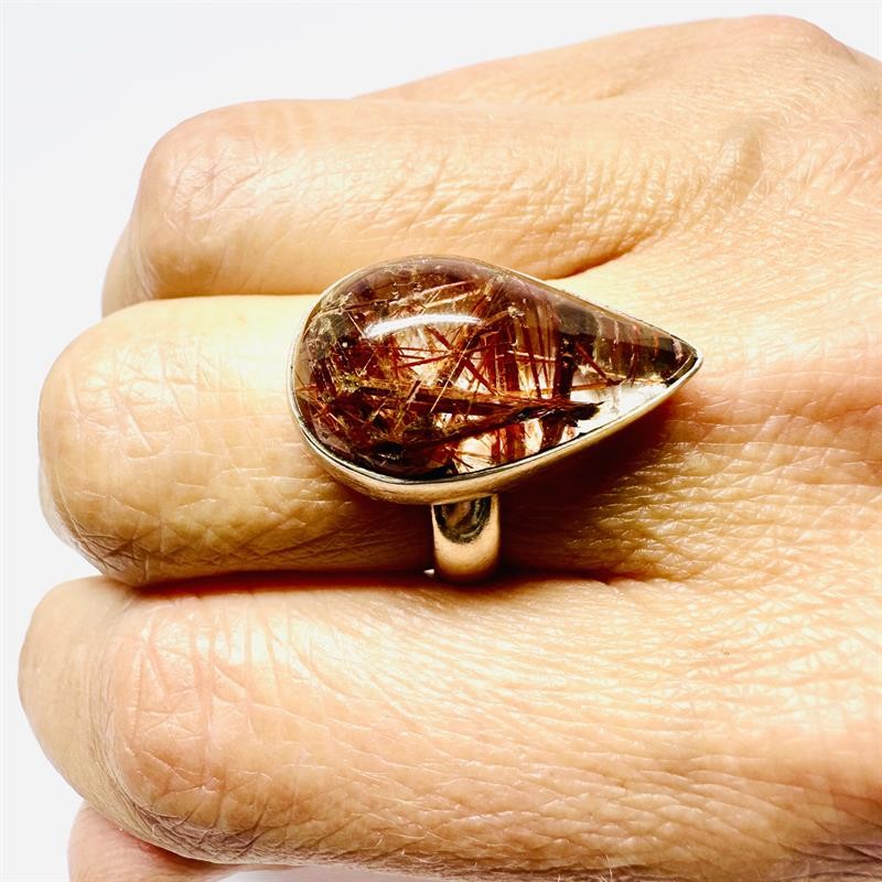 Nadčasový, moderní, nevšední stříbrný prsten. Šperk zdobí hladce, do tvaru slzy vybroušený křišťál, bohatě inkludovaný červeným rutilem. Kámen přírodního původu z Madagaskaru je po celém obvodu zasazen do hladké cargle. Stříbro ryzosti 925/1000, celková váha 6,74 g. Velikost 53. Velmi dobrý stav.
