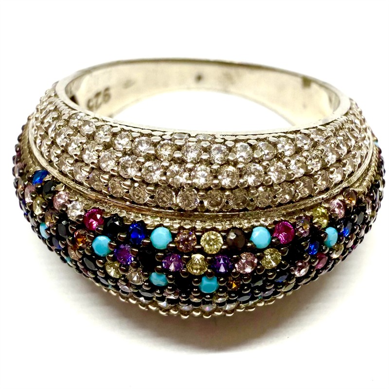 Elegantní, nápaditý stříbrný prsten. Šperk byl vyroben ze sterlingového stříbra (925/1000), o celkové váze 5,64 g. Šperk zdobí velké množství drobných, pečlivě fasovaných kubických zirkonií v multikolorním provedení. Velikost 55. Perfektní stav.