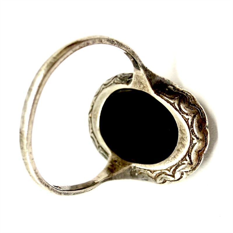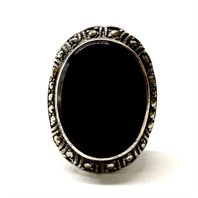 Půvabný, elegantní prsten z počátku 20.století. Šperk zdobí černý onyx oválného tvaru, rámovaný elegantně se třpytivými markazity. Prsten byl vyroben ze stříbra ryzosti 800/1000, o celkové váze 5,55 g. Velikost 57. Výborný stav