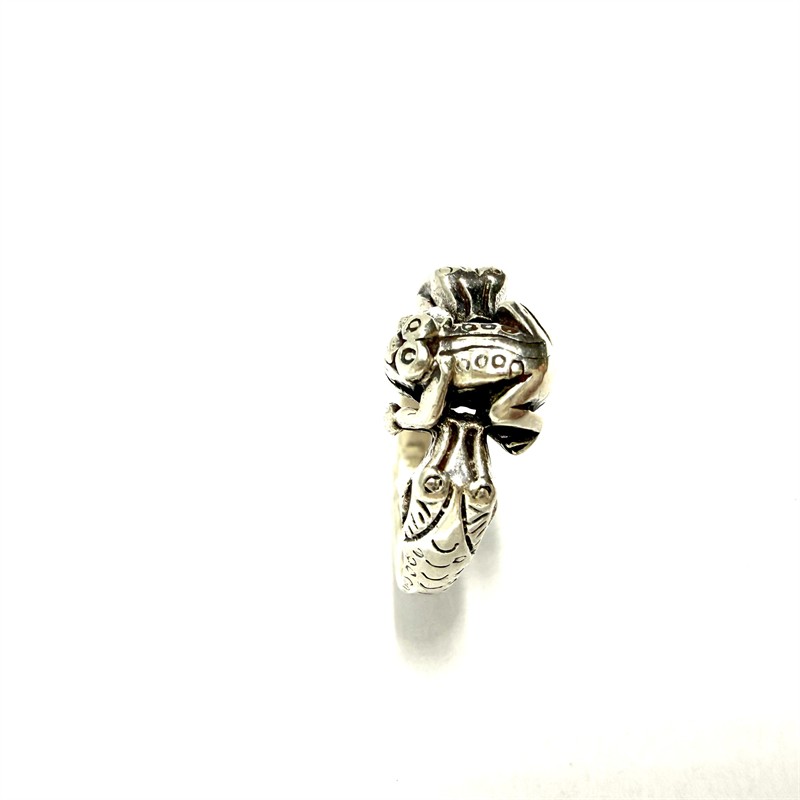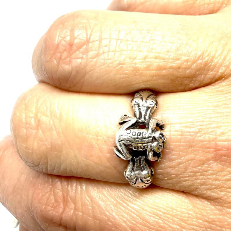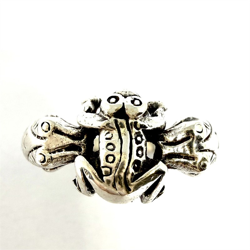 Jemný, stříbrný prsten zdobený věrně znázorněnou žábou. Stříbro sterlingové ryzosti (925/1000). Váha 3,88 g. Velikost 54. Profesionálně vyčištěno.