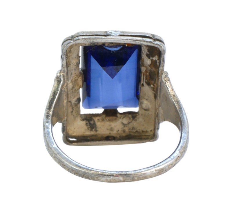 Prsten vyrobený ze stříbra ryzosti 800/1000 zdobený syntetickým safírem a markazity. Obroučka prstenu je zdobena jemnými rytými motivy, což je charakteristický prvek starožitných šperků z první poloviny 20. století. Rozměry hlavy prstenu 1,9 x 1,5 cm. Velikost 50. Hmotnost 4,07 g.