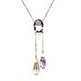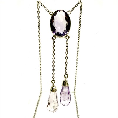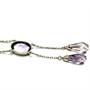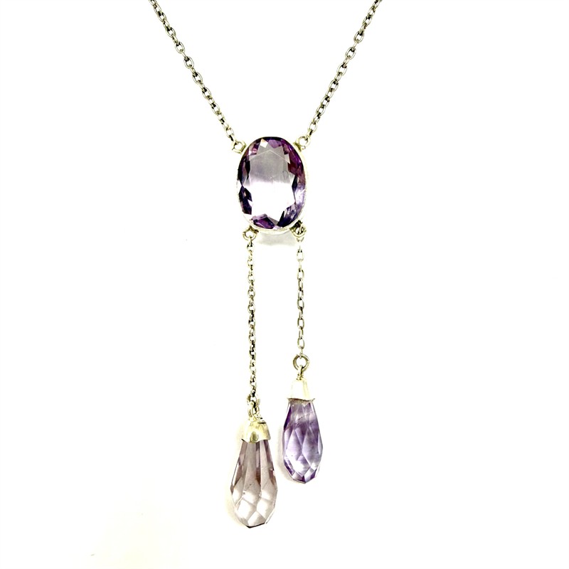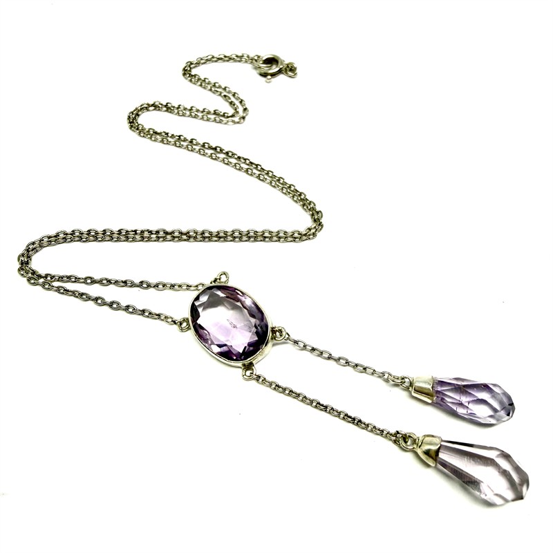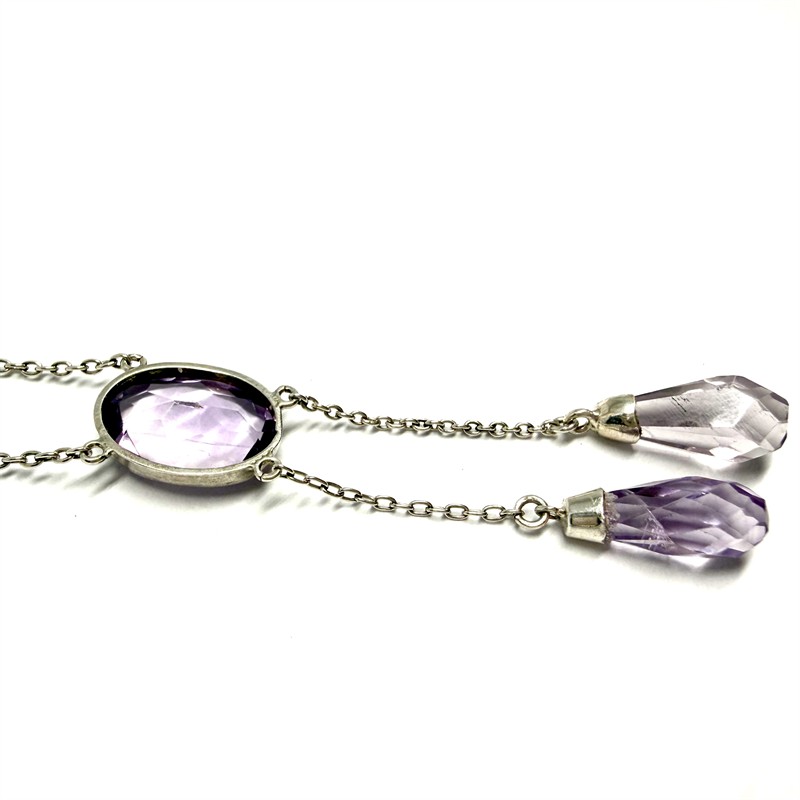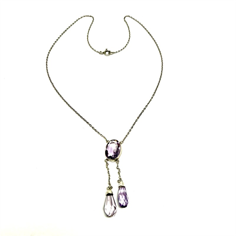 Půvabný stříbrný náhrdelník z období první republiky. Šperk byl zhotoven ze stříbra ryzosti 830/1000. Celková váha 4,33 g. Šperk zdobí centrální ametyst fazetového brusu s ametystovými ověsy. Délka 42,5 cm. Starý autentický šperk v perfektním stavu.