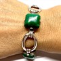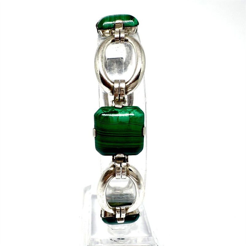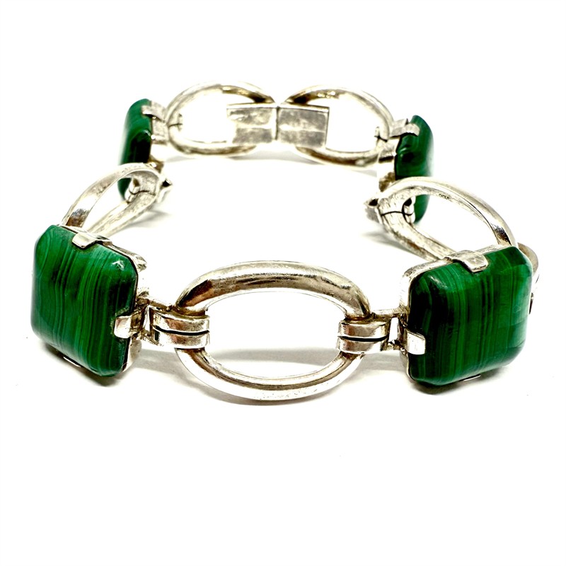 Výrazný, designový, článkový náramek. Nadčasový šperk byl zhotoven ze sterlingového stříbra (925/1000) v první polovině 20.století. Náramek zdobí čtyři sytě zelené malachity s krásnou kresbou. Celková váha 33,17 g. Délka 20 cm. Profesionálně vyčištěno, perfektní stav.