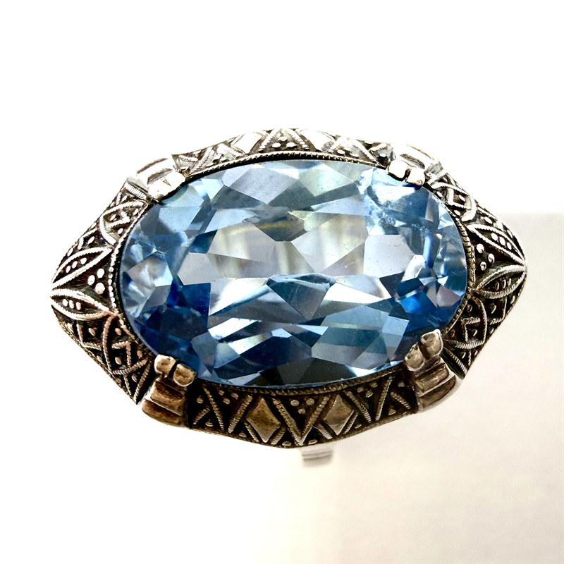 Elegantní, výrazný, perfektně zachovalý prvorepublikový prsten. Šperk je osazen větším, ocelově modrým spinelem fazetového brusu. Zhotoven ze stříbra ryzosti 935/1000, o celkové váze 6,52 g. Velikost 56. Jedná se o starý šperk v perfektním stavu, nikoliv současnou napodobeninu.