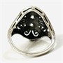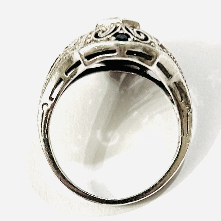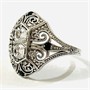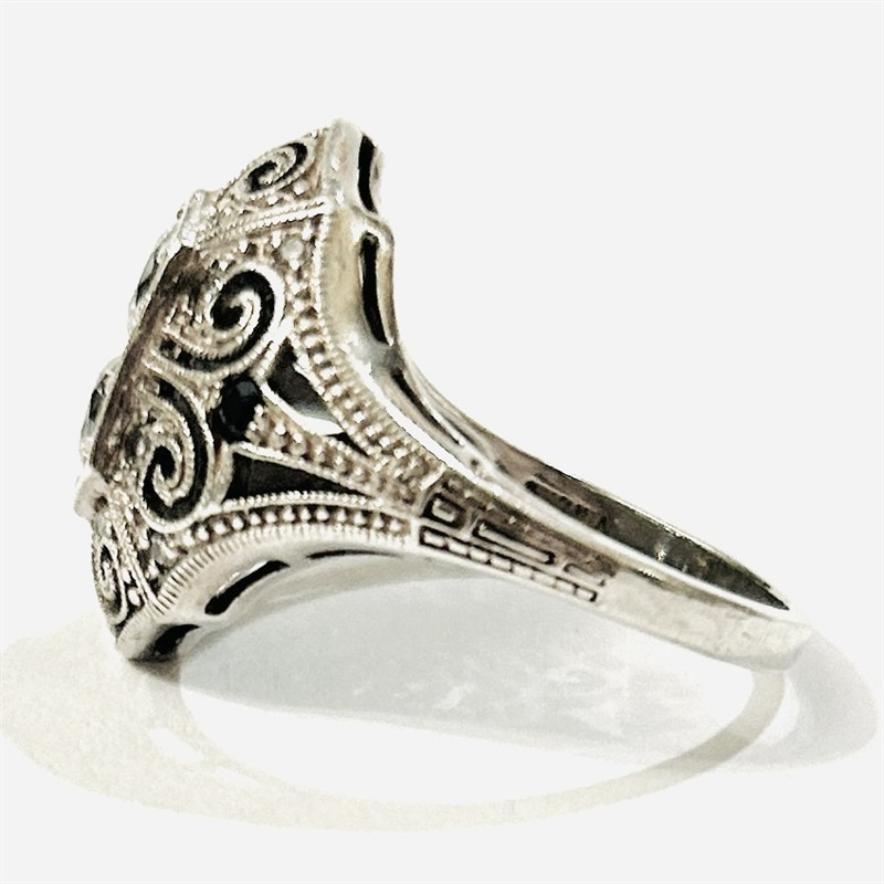 Elegantní, dekorativní prsten zhotovený patrně dle dobové art-deco předlohy, kupolovitá hlavice bohatě prořezávána motivem volut, osazeno přírodními modrými safíry a čirými kameny kulatého briliantového brusu, povrch zušlechtěn technikou zrnkování. Patrně severoamerická zlatnická práce z poslední pětiny 20. století. Zhotoveno z nezlaceného stříbra o ryzosti 925/1000; nově opatřeno puncem S-61 (kozlík 2), značka výrobce, značení "STERLING" a "VINTAGE" zevnitř šíny. Hmotnost 5,04 g, velikost 57, délka hlavice 19 mm. Ve velmi zachovalém stavu, odborně vyčištěno a vyleštěno zlatníkem.