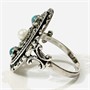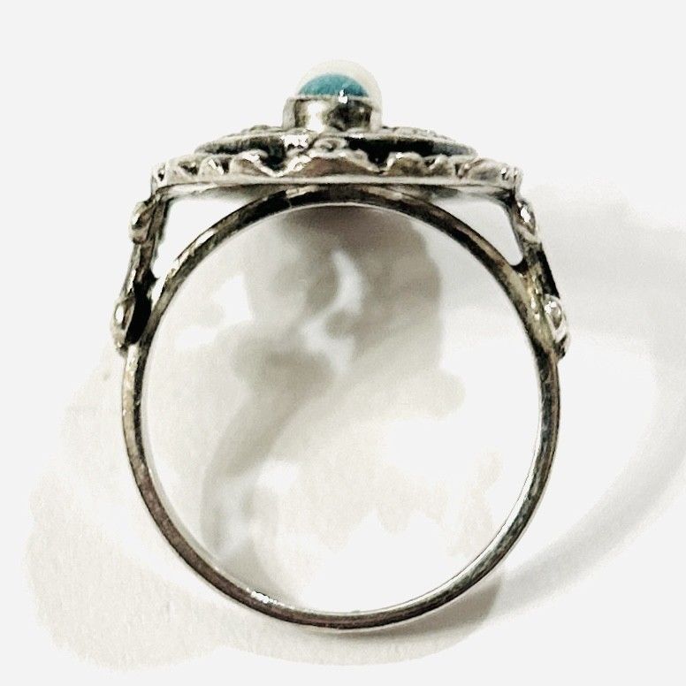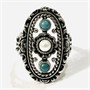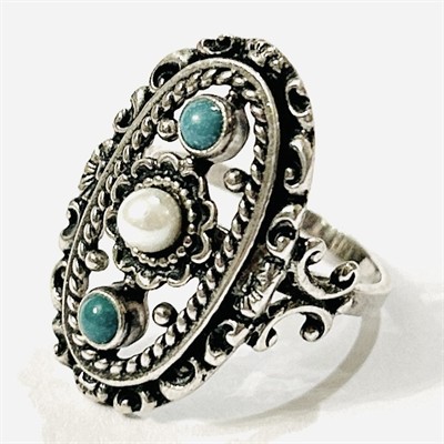 Stříbrný pseudohistorizující prsten s tyrkysy a perlou