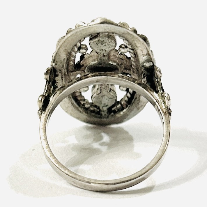 Honosný, historizující prsten, oválná prořezávaná hlavice osazena 2 muglemi přírodního nazelenalého tyrkysu, uprostřed přírodní kultivovaná bílá perla, bohatě plasticky dekorováno. Německá zlatnická práce z poslední čtvrtiny 20. století. Zhotoveno z nezlaceného, umělé patinovaného stříbra o ryzosti 835/1000; nově označeno pucem S-68 (zajíc 4) a ryzostní číslo zevnitř šíny. Hmotnost 5,33 g, velikost 55, délka hlavice 26 mm. Ve velmi zachovalém stavu.