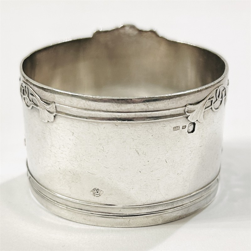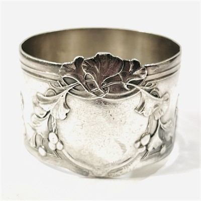 Velice půvabný velký kroužek na ubrousek z období francouzské secese, středu dominuje prázdná kartuše pro případný monogram, jež je rámována stylizovaně vinutými listy ginkgo biloba, které se po krajních linií nesou i po širším obvodu, jemně plasticky modelováno s efektním přesažením okraje. Designem velmi zdařilá, solidní francouzská stříbrnická práce z dílny Henriho Soufflota z přelomu 19. a 20. století. Zhotoveno z nezlaceného stříbra o ryzosti 950/1000; vyhotoveno osvědčení puncovního úřadu, francouzský punc "Minerva", dovozový rakouský punc "křídlo 4", neodpovídající ryzostní číslo a značka výrobce "HS" zvnějšku zezadu. Hmotnost 52,60 g, vnější průměr průměr 53 cm, šířka 40,5 mm. Ponecháno s přirozenou mírnou patinou, lze vyčistit, úměrné stopy užívání, celkově v zachovalém stavu.