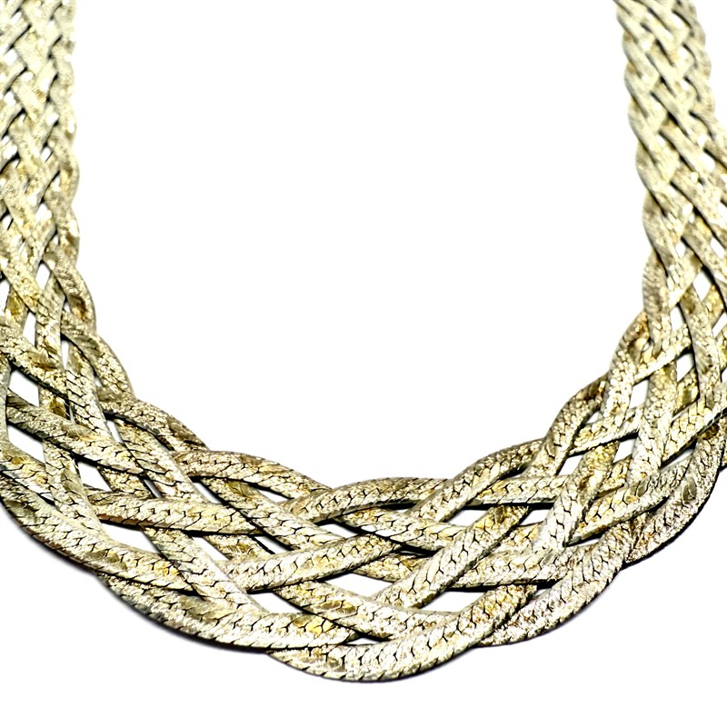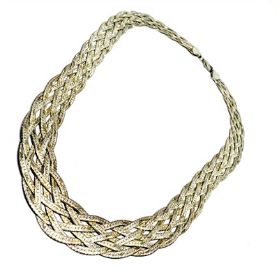 Efektní náhrdelník tvořený šesti plochými, v cop spletenými řetízky. Sterlingové stříbro (925/1000), celková váha 21,34 g. Délka 41,5 cm, šířka 1,2 cm. Výborný stav.