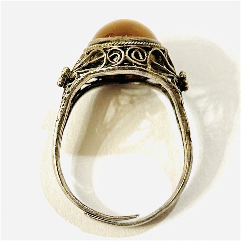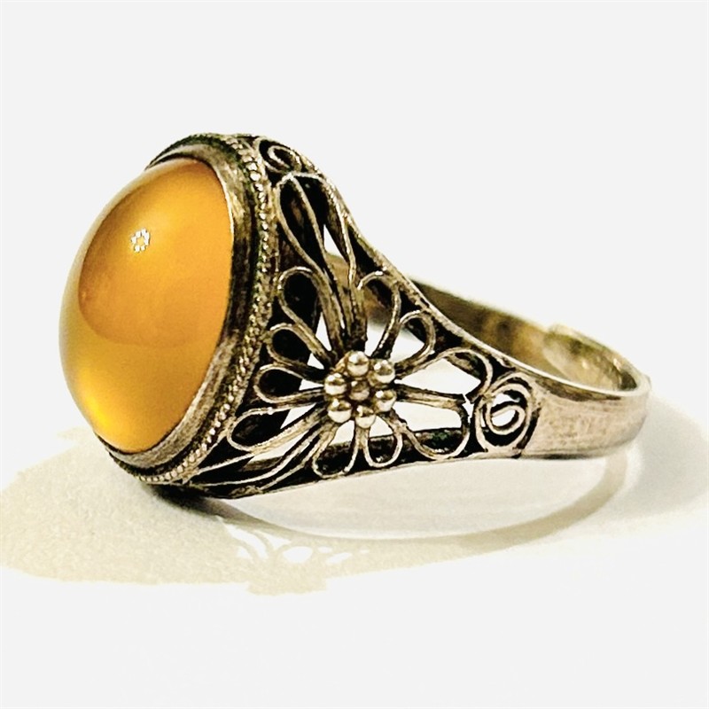 Půvabný, starožitný prsten osazený oválnou muglí žlutě zbarveného přírodního karneolu fasováno v plně přiléhající obrubě, rámováno pletencem, bok a ramena šíny zdobena filigránoými volutami a granulovanými kuličkami. Patrně východoasijská zlatnická práce z 20. až 30. let 20. století. Zhotoveno z nezlaceného stříbra o ryzosti 925/1000; československý dovozový punc S-43 (lilie s Č) a ryzostní číslo zvnějšku šíny. Hmotnost 3,45 g, nastavitelná velikost okolo 55, délka hlavice 14,5 mm. Ponecháno s přirozenou patinou, lze vyčistit, jinak v zachovalém stavu.