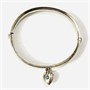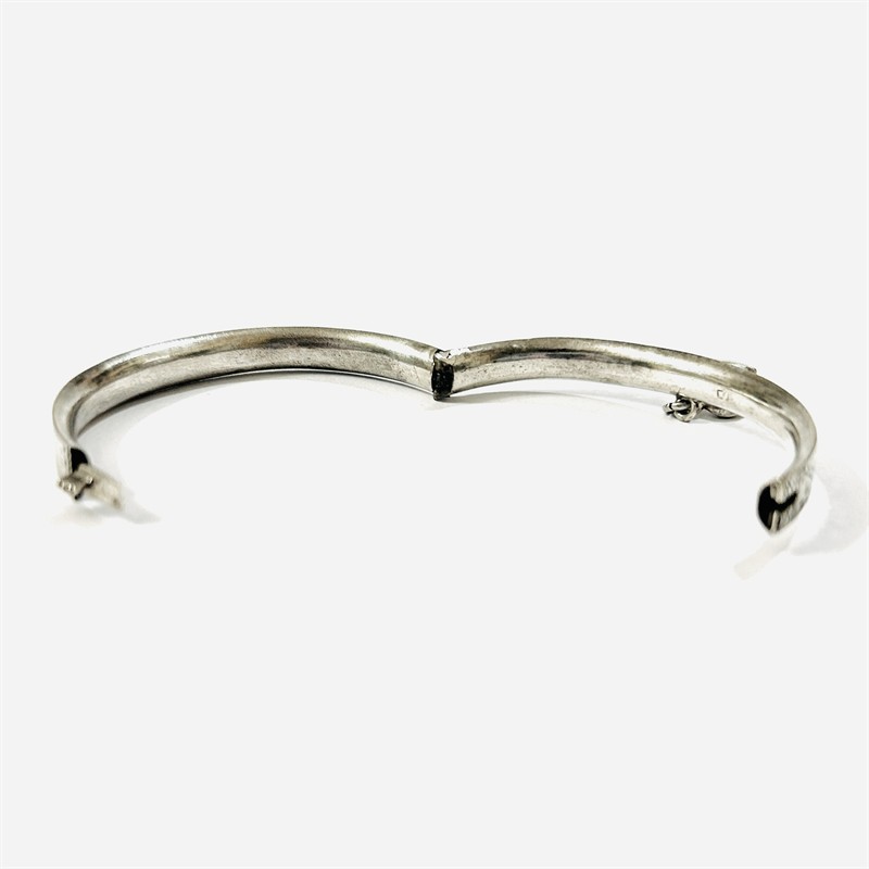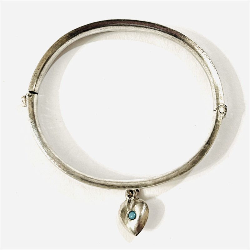 Elegantní otevírací náramek, jehož frontální část je zdobena gravírováním s motivem abstrahovaných listů, ověsek ve tvaru srdce osazen kulatou muglí patrně tyrkysového skla. Kvalitní zlatnická práce z území rakousko-uherské monarchie z poslední čtvrtiny 19. až počátku 20. století. Vyrobeno technikou dutého kovu. Zhotoveno z nezlaceného stříbra o ryzosti 750/1000; rakousko-uherský punc S-34 (lev 4) a zásobní značka Z-37 (moucha) na zapínacím jazýčku, mistrovská značka též a zevnitř náramku. Hmotnost 6,52 g, vnější délka 54 mm, vnitřní 48 mm (velikostí tedy na subtilnější zápěstí), vnější šířka 46 mm, vnitřní 41 mm, výška 6 mm. Jazýčkové zapínání v pořádku, později doplněný kámen, ponecháno s lehkou přirozenou patinou, lze vyčistit, odborně vyčištěno zlatníkem.