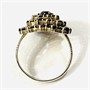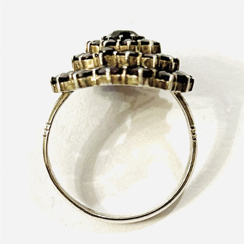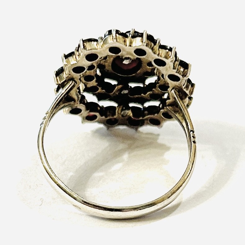 Efektní, prsten koktejlového typu s oválnou stupňovitou hlavicí osázenou českými granáty kulatého šachovnicového brusu, centrální kámen granátovým sklem oválného brusu, fasováno zrnkovou technikou. Precizní granátnická práce klenotníka Františka Šimůnka z Lomnice nad Popelkou z 2. poloviny 40. let 20. století. Zhotoveno z nezlaceného stříbra o ryzosti 900/1000; československý punc S-62 (kozlík 3) zvnějšku šíny, ryzostní čísla a mistrovská značka "FŠ" zevnitř šíny. Hmotnost 4,63 g, velikost 62, délka hlavice 22 mm, šířka 19 mm. Centrální kámen podřený, jinak v zachovalém stavu, odborně vyčištěno a vyleštěno zlatníkem.