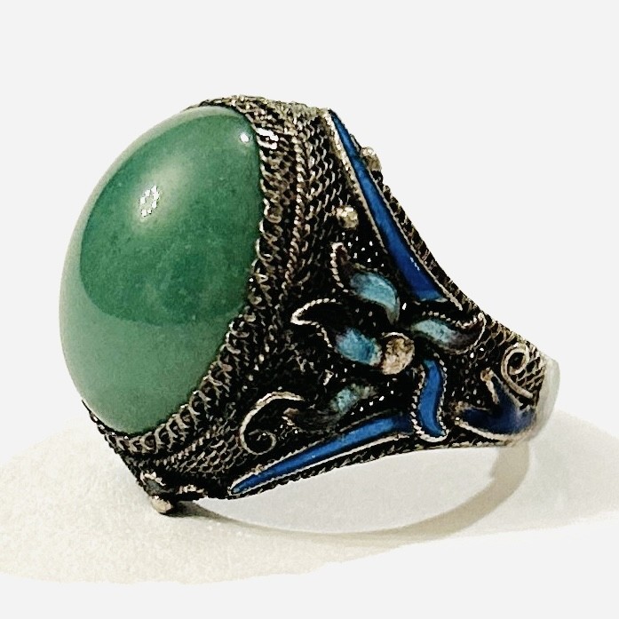 Výrazný prsten osazený oválnou muglí přírodního jadeitu, tělo tvořené filigránovou sítí zdobeno plastickýmif florálními křivkami s modro-fialovým smaltem a doplněno granulovanými kuličkami. Orientální, patrně čínská zlatnická práce z 2. třetiny 20. století, dovezeno na naše území ve stejném období. Zhotoveno z nezlaceného stříbra o ryzosti 800/1000; československý dovozový punc S-43 (lilie s Č) a ryzostní číslo zevnitř šíny. Hmotnost 6,66 g, nastavitelná velikost okolo 52, délka hlavice 22 mm. Při jedné straně chybí dekorativní trojlist, ponecháno s přirozenou patinou, lze vyčistit, jinak v zachovalém stavu.