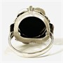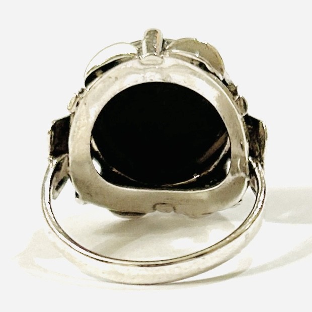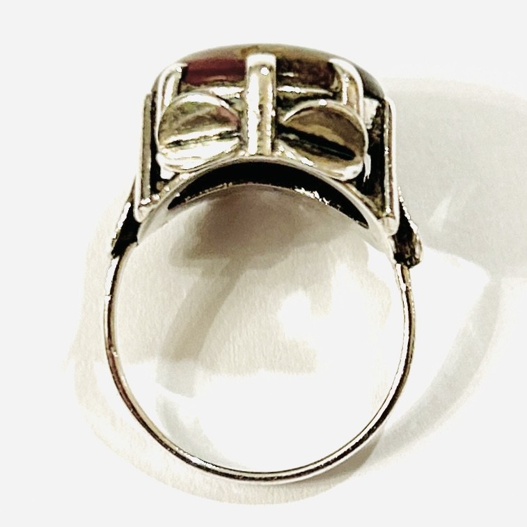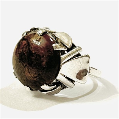 Výrazný prsten koktejlového typu osazený plochou kulatou muglí přírodního českého hnědo-červeného jaspisu, pečlivě fasováno krapnami ve vyšší plasticky tvarované hlavici. Kvalitní práce klenotnického podniku Kovozávody Turnov z 60. až počátku 70. let 20. století. Zhotoveno z nezlaceného stříbra o ryzosti 900/1000; punc S-67 (zajíc 3), ryzostní číslo a značka výrobce "KZT" zevnitř šíny. Hmotnost 4,59 g, velikost 54, délka hlavice 16 mm. Šína lehce vychýlena, celkově v zachovalém stavu, odborně vyčištěno a vyleštěno zlatníkem.