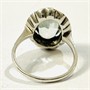 Elegantní prsten osazený přírodním světle modrým topazem oválného brusu, v ornamentálních lůžkách rámováno přírodními bílo-šedými perlami, ladná úzká šína. Kvalitní západoevropská zlatnická práce z 2. čtvrtiny 20. století. Zhotoveno z nezlaceného stříbra o ryzosti 925/1000; nově opatřeno puncem S-61 (kozlík 2) a ryzostní číslo zevnitř šíny. Hmotnost 5,12 g, velikost 56, délka hlavice 18 mm, šířka 15 mm. Velikost byla v minulosti upravována, celkově v dobrém stavu, odborně vyčištěno a vyleštěno zlatníkem.
