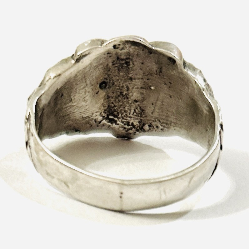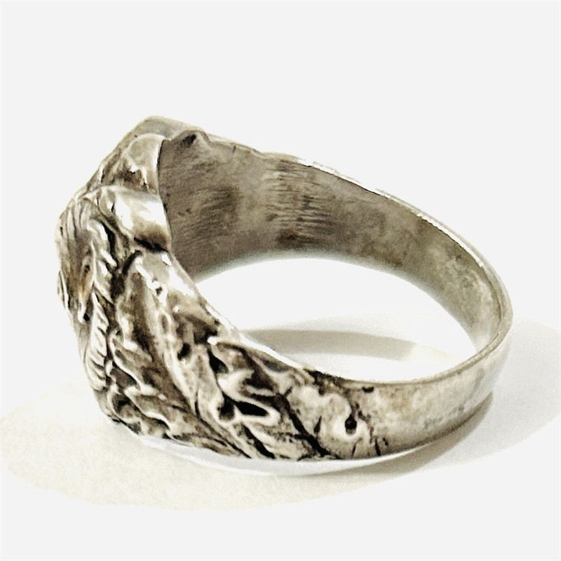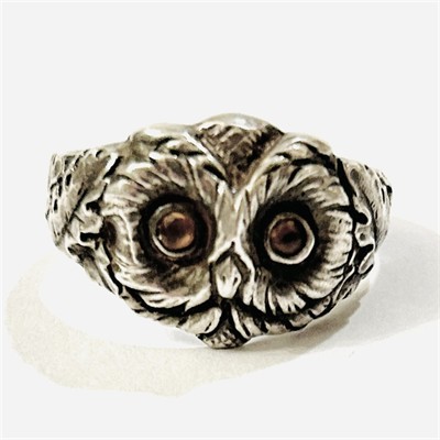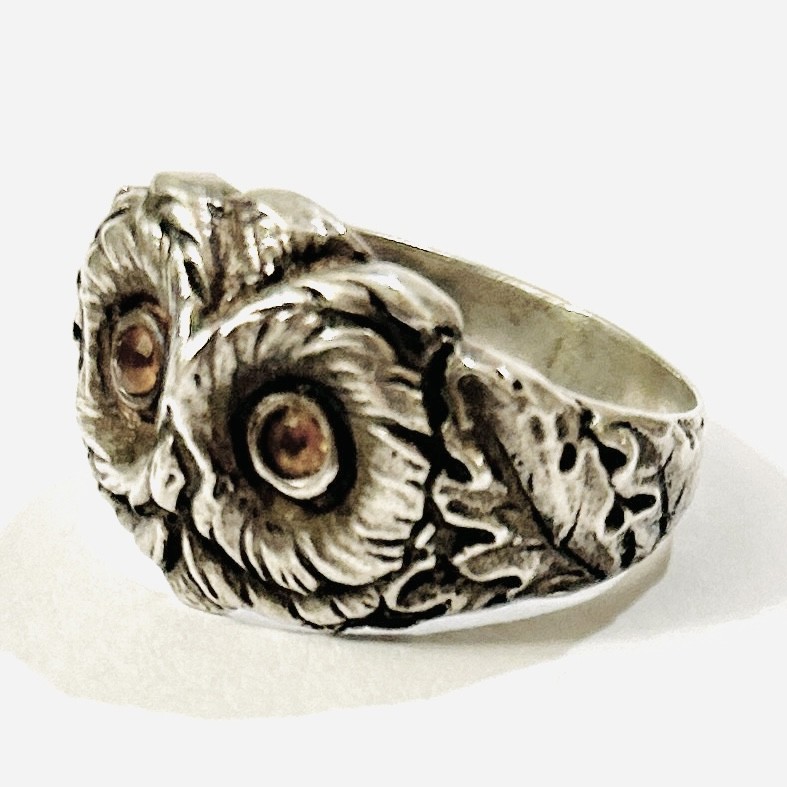 Nepřehlédnutelný, figurálně pojatý prsten s hlavicí ve tvaru soví hlavy, jejíž oči jsou osazeny přírodními citríny kulatého brusu fasovaných v obrubách, při ramenech šíny dubové listy. Velmi detailně plasticky provedeno, tematicky myslivecký šperk. Solidní německá medailérská a zlatnická práce z první třetiny 20. století. Sběratelsky zajímavé. Zhotoveno z nezlaceného stříbra o ryzosti 830/1000; vyhotoveno osvědčení puncovního úřadu, ryzostní číslo zevnitř šíny. Hmotnost 7,29 g, velikost 62,5, šířka 14,5 mm. Ponecháno s přirozenou patinou, lze vyčistit, velikost v minulosti upravována, celkově v zachovalém stavu.