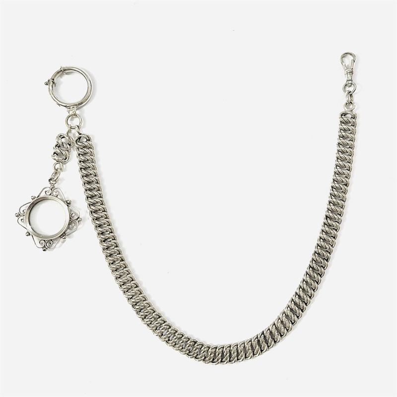 Starožitný masivnější řetízek k hodinkám/šatlén z vazby pletený "pancr", připojen ověsek s medailonem na fotografie (včetně krycích sklíček), jemný volutový rámeček s granulovanými kuličkami. Dobový pánský šperk v tradičním pojetí, kvalitní vídeňská zlatnická práce z poslední pětiny 19. století. Zhotoveno z nezlaceného stříbra o ryzosti 750/1000; rakousko-uherský punc S-34 (lev 4), písmeno „A“ u puncu (značí vídeňský puncovní úřad) a mistrovská značka na několika místech. Hmotnost 25,65 g, délka 33 cm, ověsek s řetízkem 6,5 cm, šířka vazby 8 mm, medailon 30 mm. Zapínání formou pérového kroužku a karabinky v pořádku, celkově v zachovalém stavu, odborně vyčištěno a vyleštěno zlatníkem.