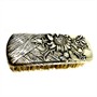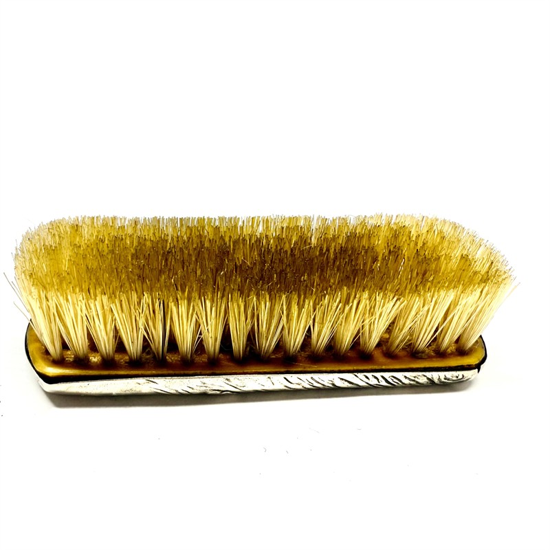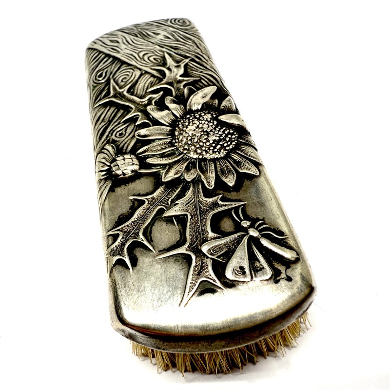 Velmi půvabný, toaletní kartáček se stříbrnou rukojetí. Kartáček zdobí plasticky ztvárněný motiv bodláků s motýlem. Stříbro ryzosti 800/1000, celková váha 26,38 g. Zhotoveno osvědčení Puncovního úřadu. Rozměry cca 8 x 3 cm. Výborný stav.