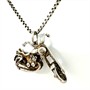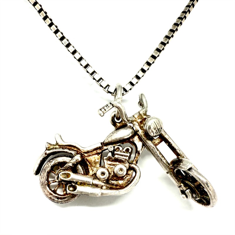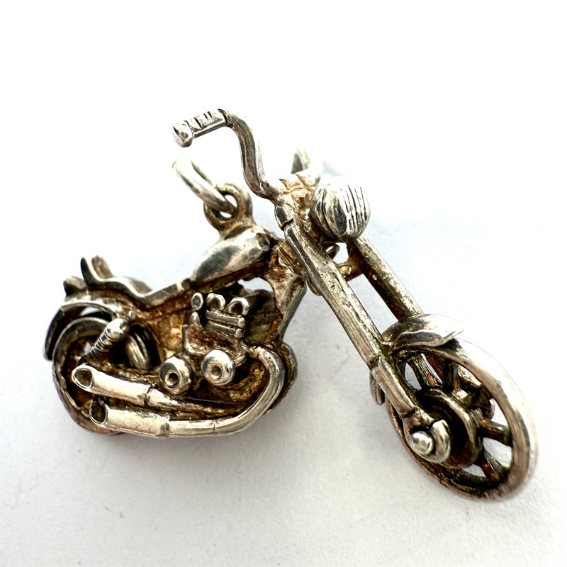 Stříbrný závěs -velmi detailně, realisticky propracovaná motorka. Sterlingové stříbro (925/1000), celková váha 5,47 g. Rozměry cca 3 x 2 cm. Kola i řidítka jsou otočná. Řetízek není součástí prodeje. Výborný stav.