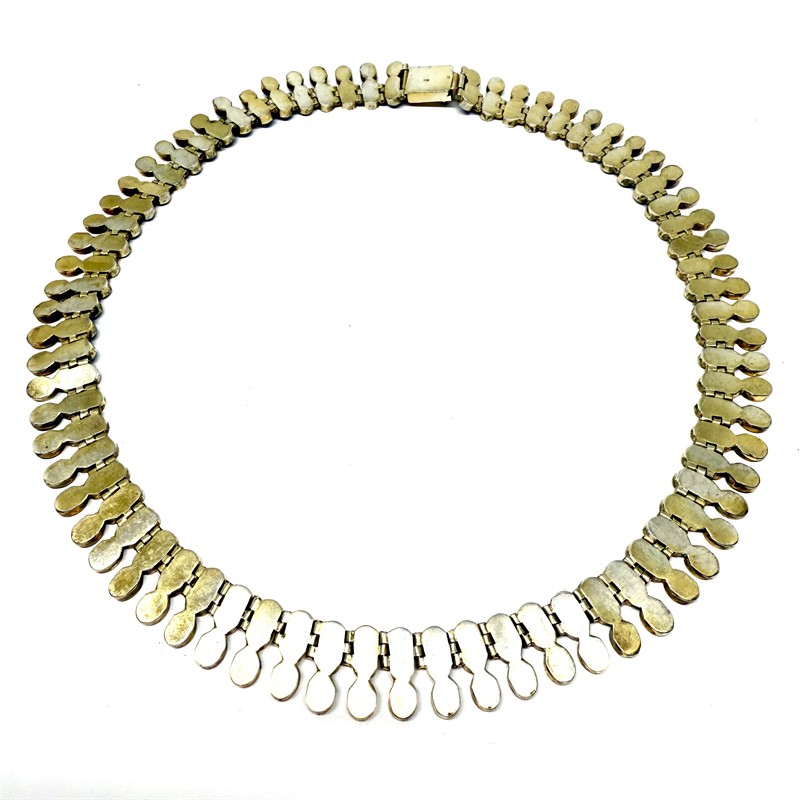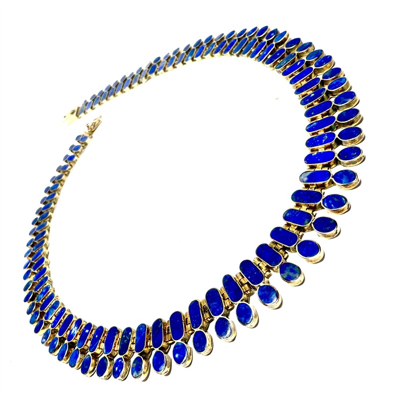 Výrazný, nepřehlédnutelný náhrdelník ze zlaceného stříbra. Šperk byl zhotoven v Mexiku z téměř ryzího stříbra (950/1000), o celkové váze 57,05 g. Náhrdelník se skládá z mnoha desítek vzájemně propojených článků. Ty jsou osazeny lápisy lazuli oválného tvaru, sytého modrého odstínu. Délka 45 cm. Pojistka zapínání. Nevšední, monumentální šperk ve výborném stavu.