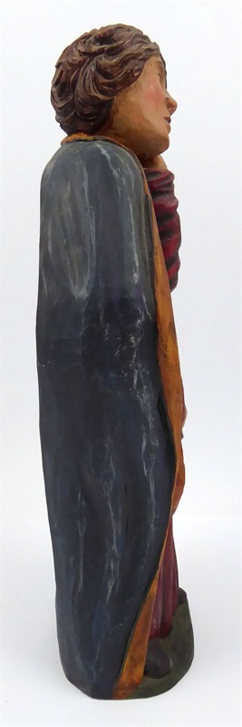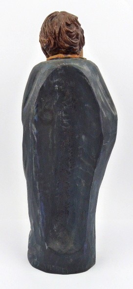 Dřevořezba, polychromie. Přiloženo osvědčení Národního památkového ústavu České republiky. Vyšší dřevořezba představující svatého Jana Evangelistu byla zřejmě kdysi součástí Kalvárie. Svatý Jan je zachycen v čelním pohledu. Hlavu s krátkými hnědými vlasy má výrazně skloněnou k levému rameni a podpírá si ji dlaní pozvednuté levé ruky. Pravou ruku ohnutou v lokti má spuštěnou před tělem. Oděn je v dlouhém řaseném rouchu červené barvy a tmavomodrém plášti s širokým světle okrovým lemem. Zadní strana sošky je hloubena. Na zeleném nízkém podstavci. Střední Evropa, 20. století. Výška 41 cm.