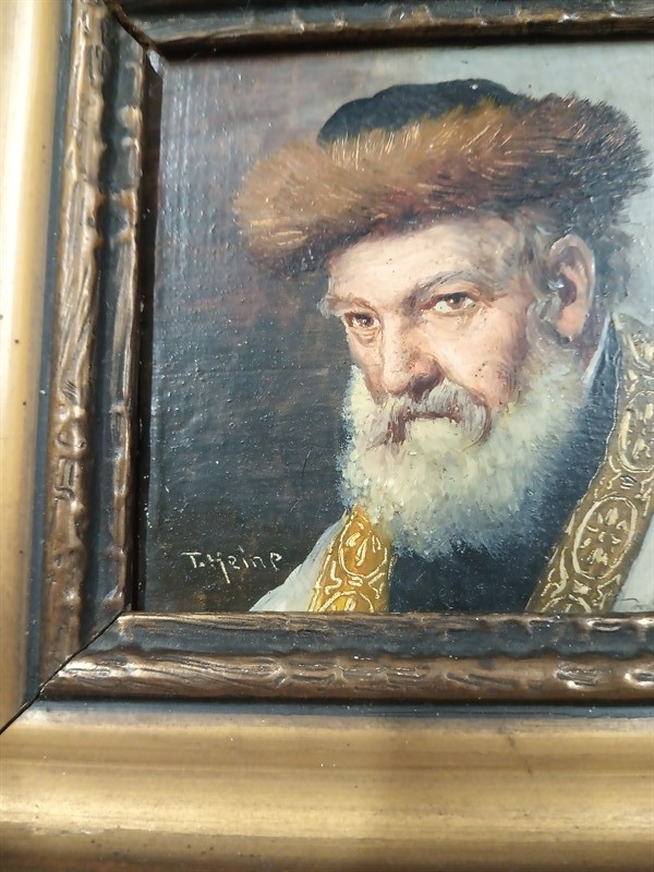 Portrét žida, olej na desce , signováno T.Heine , rám mírně poškozený . Rozměry bez rámu 11 x 11 cm , rozměry celkem 19,5 x 19,5 cm .