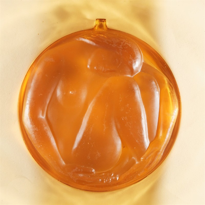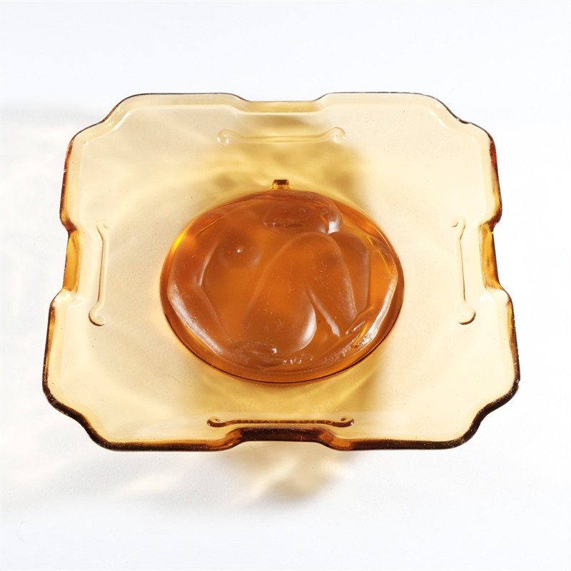 návrh plastiky J. Hromádko, produkce Českomoravské sklárny, značeno těžko čitelně „HROMÁDKO“ na dolní liště, datováno „Vánoce 1940“, rozměry 21 x 21 x 3 cm, průměr medailonu 11,5 cm, zčásti matované ručně lisované sklo medové barvy