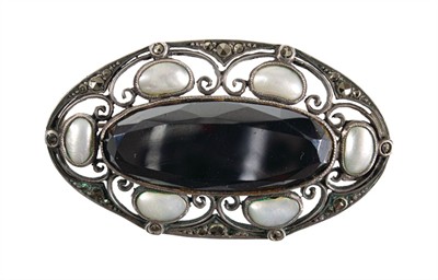 Theodor Fahrner, Pforzheim, Německo, originální secesní stříbrná brož s fazetovaným onyxem , perletí a markazity od proslulé německé šperkařské manufaktury Theodor Fahrner z německého města Phorzheim pochází z období německého Jugendstilu, tedy z počátku 20. století exkluzivní originální brož, velmi precizní a jemná šperkařská práce, šperk je vyroben ze stříbra o ryzosti 800/1000 , jeho typický elegantní design a precizní ruční zpracování odpovídají stylu Jugendstil - Secese. Brož je značena výrobcem a je v perfektním, nepoškozeném, zachovalém stavu. celková hmotnost šperku je 12,38 g rozměry brože: 4,5 x 3 cm, Atest Puncovního úřadu