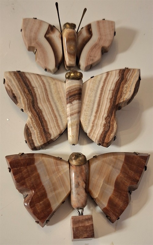 Unikátní soubor tří motýlů ve stylu art deco vykládaných různými druhy karlovarského vřídlovce. 20. léta m.s., tombak, - Malý motýl, hmotnost 10g, 2,3 x 4,5 cm - Střední motýl, hmotnost 20g, 3,5 x 6,5 cm - Velký motýl, hmotnost 24g, 5 x 6,5 cm Karlovarský vřídlovec (aragonit) vzniká usazováním z horkých karlovarských pramenů. Má vrstevnatou strukturu a různé zabarvení (od bílé, přes žlutou, červenou až po hnědou). Zpracování vřídelního kamene mělo v Karlových Varech více než stoletou tradici. Všeobecně známé jsou např. nejrůznější předměty vykládané nádhernou karlovarskou mozaikou, jejíž základ tvoří právě vřídlovec. Šperky s vřídlovcem ve stylu art deco jsou logickým vyústěním více než stoleté kamenářské tradice, bohužel však také vyústěním konečným. Umělecké řemeslo zpracování karlovarského vřídlovce zaniklo po roce 1945 odsunem německého obyvatelstva.