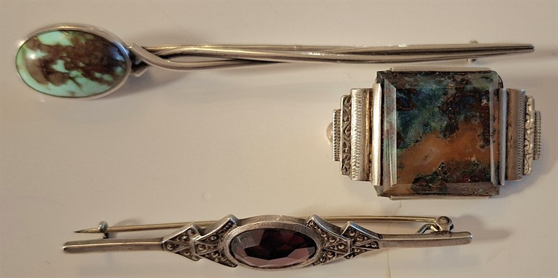Funcionalistická stříbrná broz s centrálním mechovým achátem (2x2 cm), 30. léta m.s. celková hmotnost 9 g. Celkový rozměr 3,5 x 2,2 cm, stříbro 800/1000, puncováno dvojkříž s 5 Stříbrná brož s centrálním almandinem a markazity, stříbro 925/1000, puncováno celková hmotnost 5,5 g, 6,5 x 1 cm Velká funkcionalistická brož s tyrkysem, rozměr brože 9 x 1,3 cm, mistrovská značka ZS, stříbro 900/1000, puncováno, originální turnovská autorská práce, výborná zachovalost,