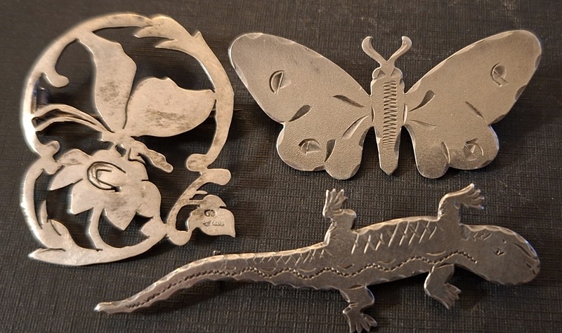 Stříbrná prořezávaná brož s motýlem na květině, stříbro 800/1000, puncováno, mistrovská značka VS v obloučcích, pozdní art deco, počátek 40. lét m.s. 4,5 x 3,5 cm. hmotnost 5g, Stříbrný motýl, stříbro 900/1000, puncováno dvoukříž, mistrovská značka JJ – Josef Javůrek, 20. léta m.s. rozměr 5,2 x 2,6 g, hmotnost 6 g, Stříbrná gravírovaná brož – ještěrka, stříbro 900/1000, puncováno dvojkříž 20. léta m.s., 6,7 x 2,2 cm, hmotnost 5 g, mistrovská značka JJ – Josef Javůrek