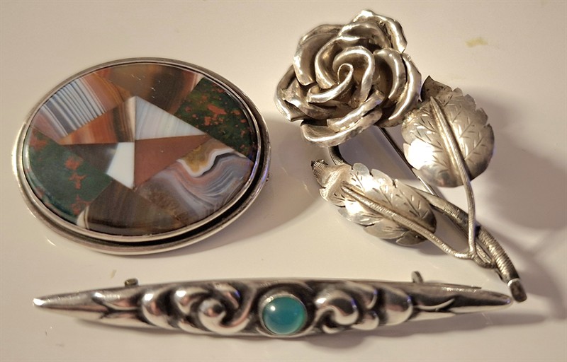 Velká stříbrná růže se dvěma listy, ve stylu art deco, stříbro 900/1000, puncováno, rozměr 6 x 2,5 cm, art deco 20. léta m.s. - Stříbrná brož ve stylu art deco se středovým zeleným kamenem (chryzopras) stříbro ryzost 830/1000, puncováno, hmotnost 3,8 g, rozměr 6,5 x 1 cm, značeno VmF (pp. Německo), art deco, 20. léta m.s. - Oválná stříbrná brož s originální mozaikou sestavenou z polodrahokamů, vynikající práce turnovských šperkařů, puncováno, stříbro 835/1000, jehlice OK, rozměr 4 x 3,3 cm, hmotnost 13g, art deco, 20. léta m.s.