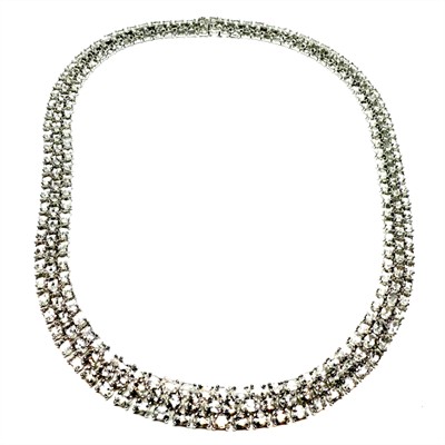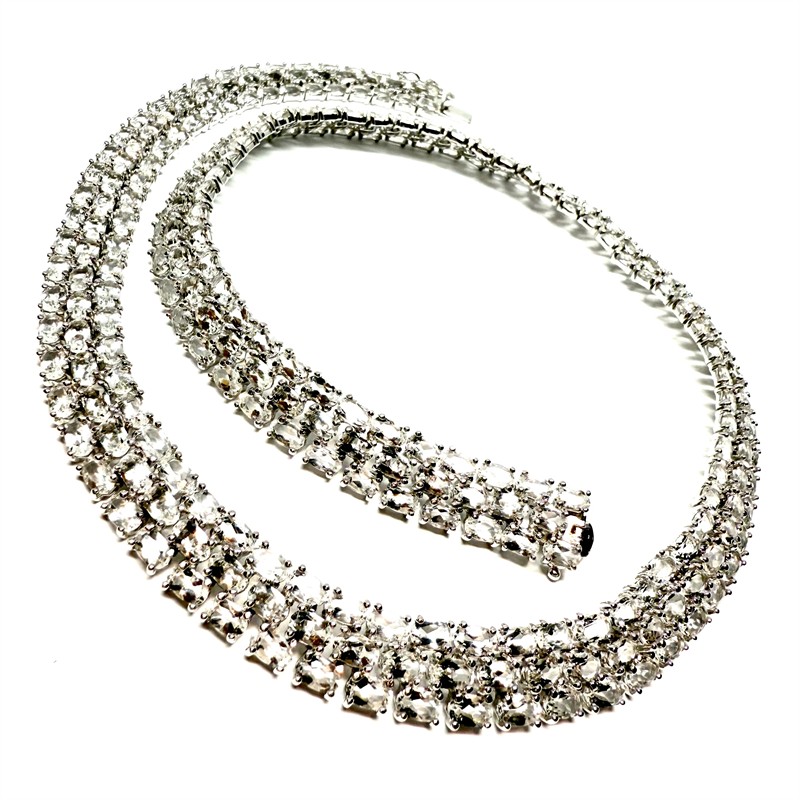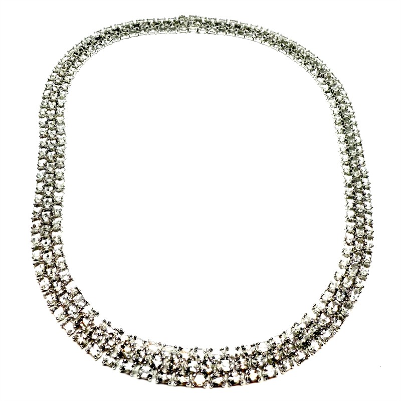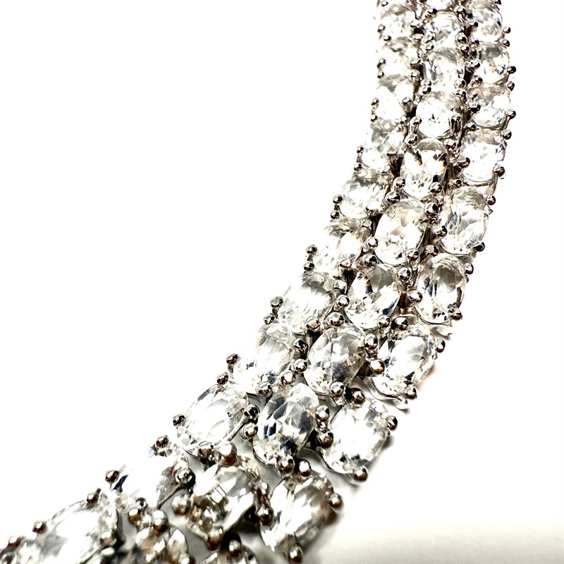 Efektní, stříbrný náhrdelník, bohatě zdobený horskými křišťály oválného tvaru. Šperk byl zhotoven ze sterlingového stříbra (925/1000) o celkové váze 53,44 g. Přítomna pojistka zapínání. Značeno puncovní, ryzostní a autorskou značkou. Profesionálně vyčištěno, perfektní stav.