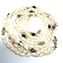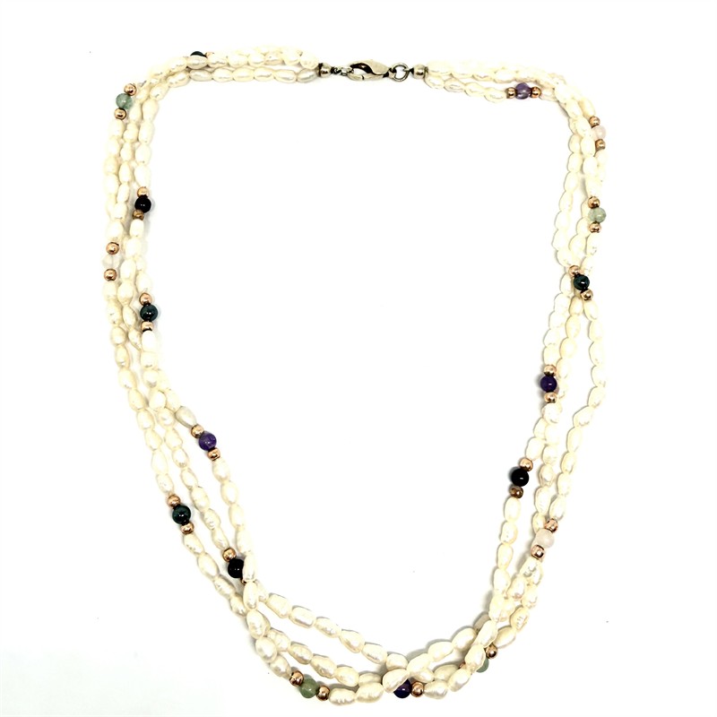 Elegantní náhrdelník tvořený třemi řadami bílých říčních perel. Šperk je protkán multikolorními kuličkami drahých kamenů. Každý z drahých kamenů rámuje zlacená kulička. Šperk zakončen bytelnou karabinou ze zlaceného stříbra sterlingové ryzosti (925/1000). Délka 46 cm.