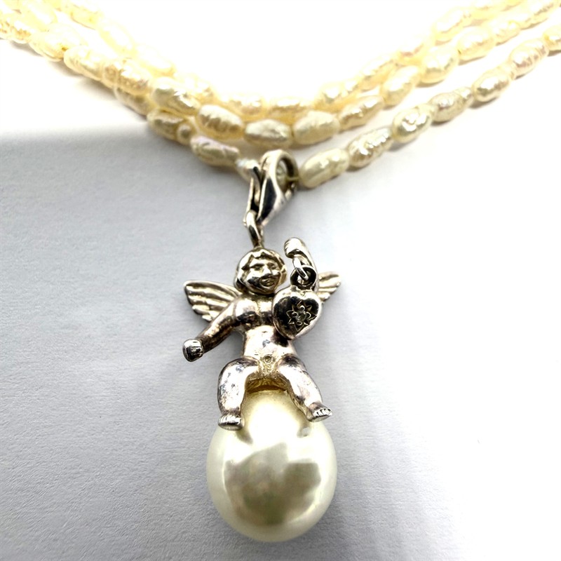 Velmi půvabný, třířadý náhrdelník z bílých říčních perel zdobený odnímatelným závěsem anděla držícího drobné srdce. Anděl sedí na bílé perle o průměru 1 cm. Šperk je zakončen zapínáním ze sterlingového stříbra.(925/1000). Váha 19,35 g. Délka náhrdelníku 43cm. Závěs dlouhý cca 3 cm. Výborný stav.